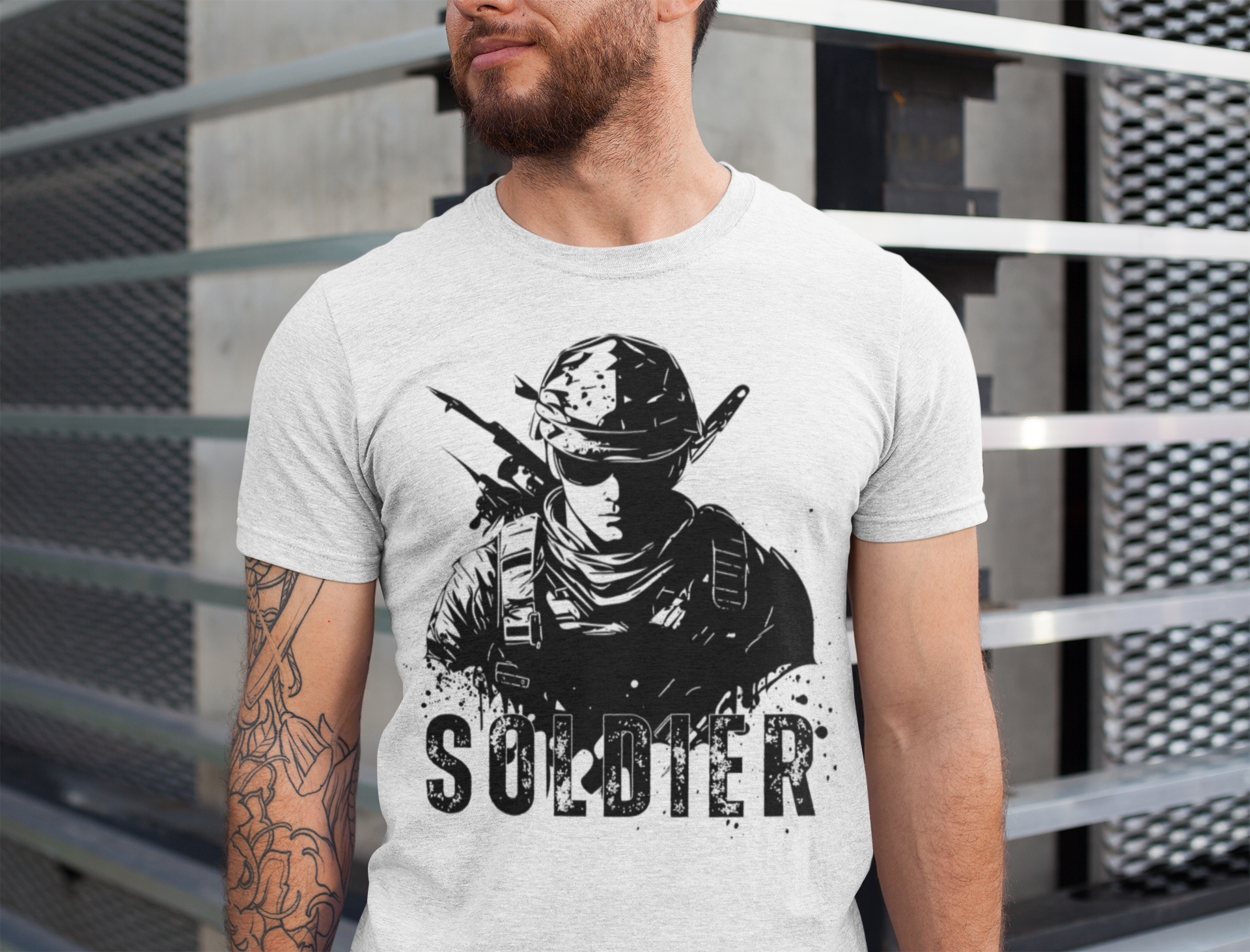 The front of the t-shirt features a high-definition soldier illustration in black, symbolizing bravery, resilience, and pride. This artwork is designed to stand out with its sharp detail and intense expression, enhanced by a dynamic splatter effect and the bold “SOLDIER” typography beneath.
